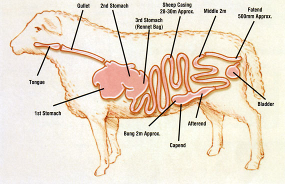 Sausage natural casing is indeed the very submucousal layer of sheep and goats’ small intestines, shown as SHEEP CASING in the picture below: